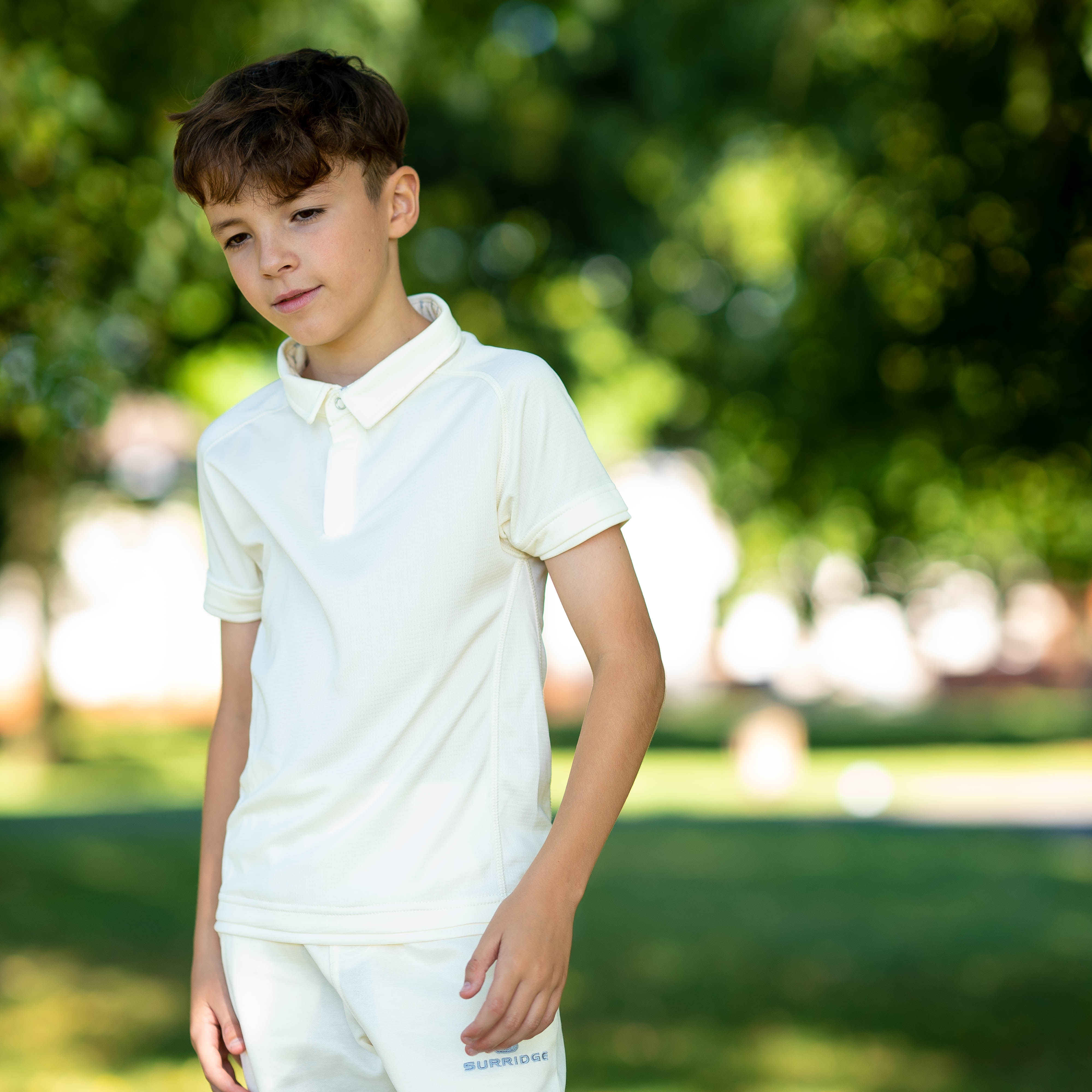 Modern fitted collared cricket shirt with pop studs ad self fabric collar.